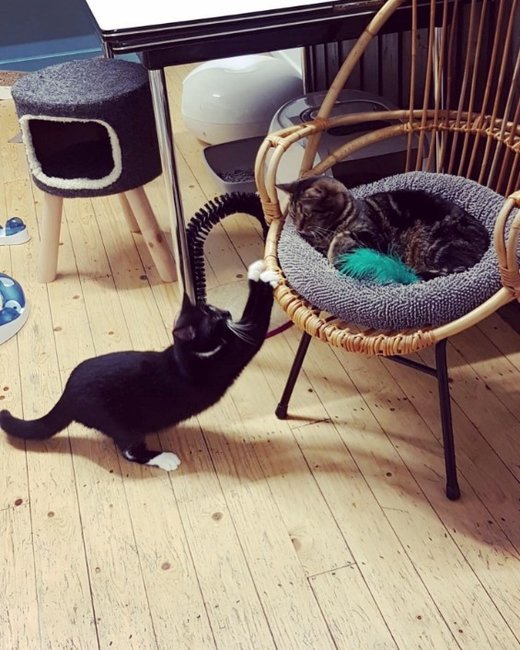 Maar je liet het niet aan je hartje komen. Na een week bij ons was je al ontdooid en begon je te spelen met de hengel, met balletjes en met alle andere poezen. In het begin waren Roos en Emma je favoriete maatjes. Samen slapen vond je ook heel erg leuk, allemaal samen in de grote zetel.