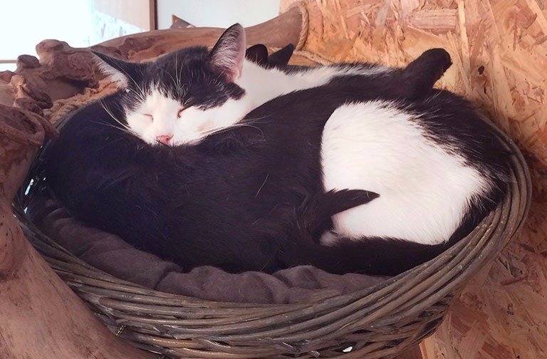 Samen natuurlijk. Eender waar, ze liggen vaak samen. Momenteel verkiezen ze de boom. Maar Marlie ligt ook heel graag in de grote zetel. Je kan dan ook zonder probleem naast haar gaan zitten, zolang je geen aanstalten maakt om haar aan te raken.